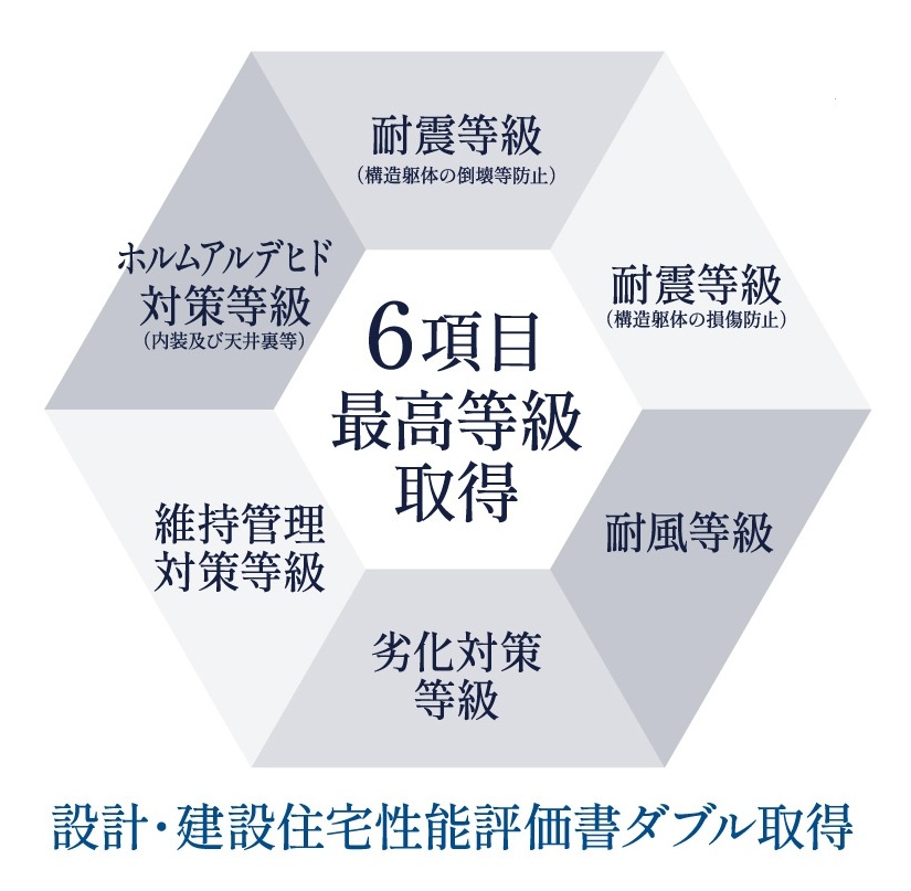 耐震等級「3」をはじめ、5分野7項目で最高等級を取得しています。